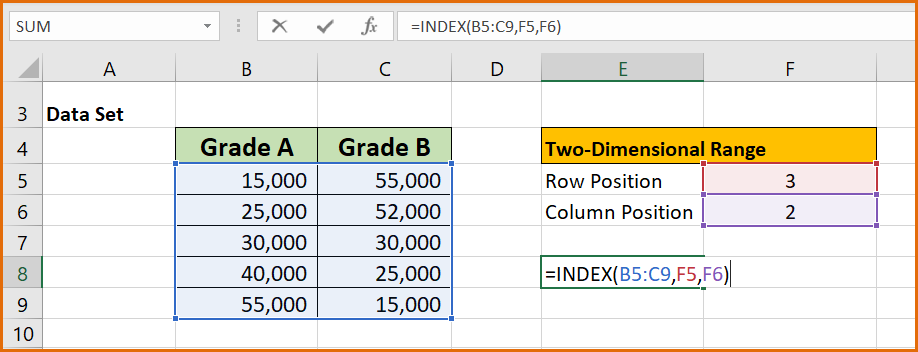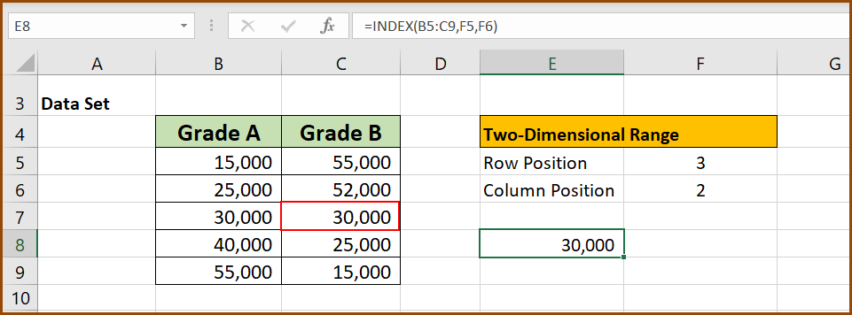 The result of the formula below shows that at the point of intersection of row 3 (cell B7) and column 2 (cell C7) cell E8 returns a value of 30,000
