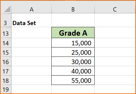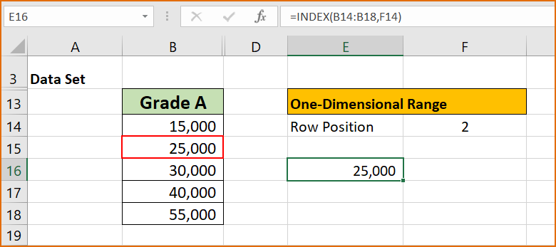 The formula returns a value of 25,000 in cell E16. This value is found in row 2 (cell B15) of the range B14:B18